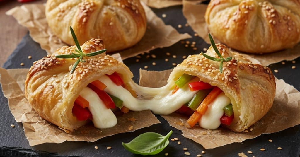Disposez les feuilletés sur une plaque recouverte de papier cuisson, badigeonnez-les d’un peu d’huile et saupoudrez de graines de sésame pour une touche encore plus croustillante. Enfournez dans un four préchauffé à 200 °C pendant environ 15 à 20 minutes, jusqu’à ce qu’ils soient dorés et croquants.