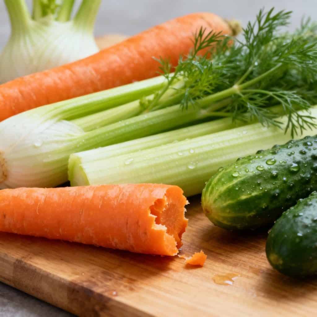 Lavez soigneusement tous les légumes. Épluchez les carottes et coupez-les en julienne ou en fines lamelles. Coupez le céleri et le fenouil en tranches fines. Pour conserver son croquant, plongez le fenouil dans de l’eau froide avec un peu de citron pendant quelques minutes, puis égouttez-le. Épépinez le poivron et coupez-le en fines lanières.