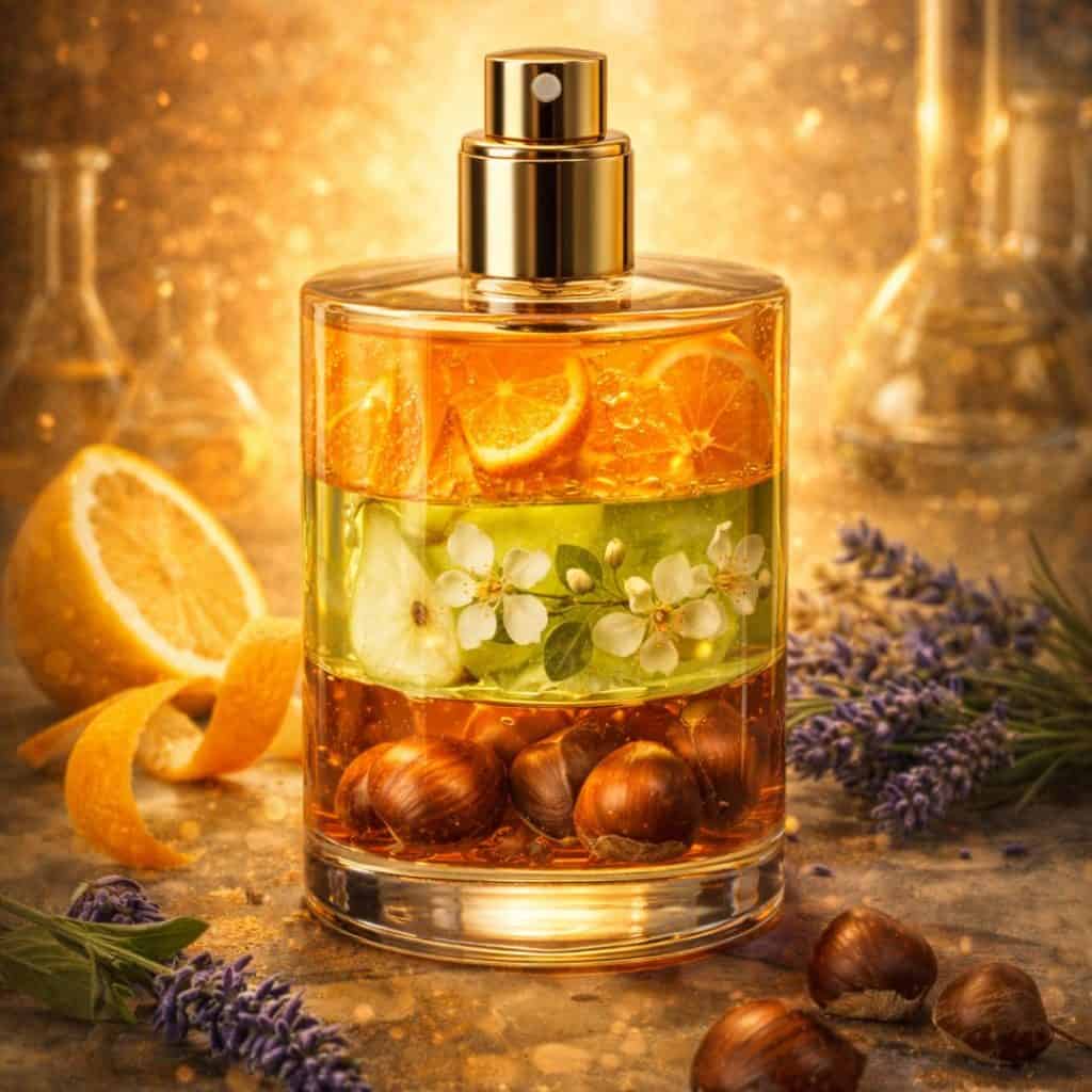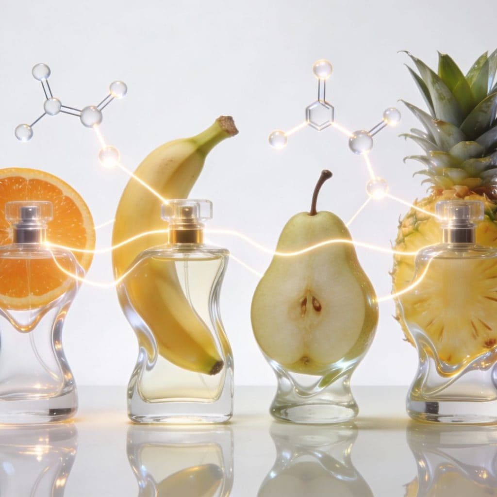 Tout comme les fruits, les parfums sont constitués d’une multitude de molécules. Les ingrédients naturels, tels que les huiles essentielles extraites de fleurs, fruits et plantes, apportent des composants authentiques. Les molécules synthétiques, développées en laboratoire, élargissent la palette olfactive en permettant de recréer, d’intensifier ou même de concevoir des fragrances totalement nouvelles, avec une longévité accrue.
