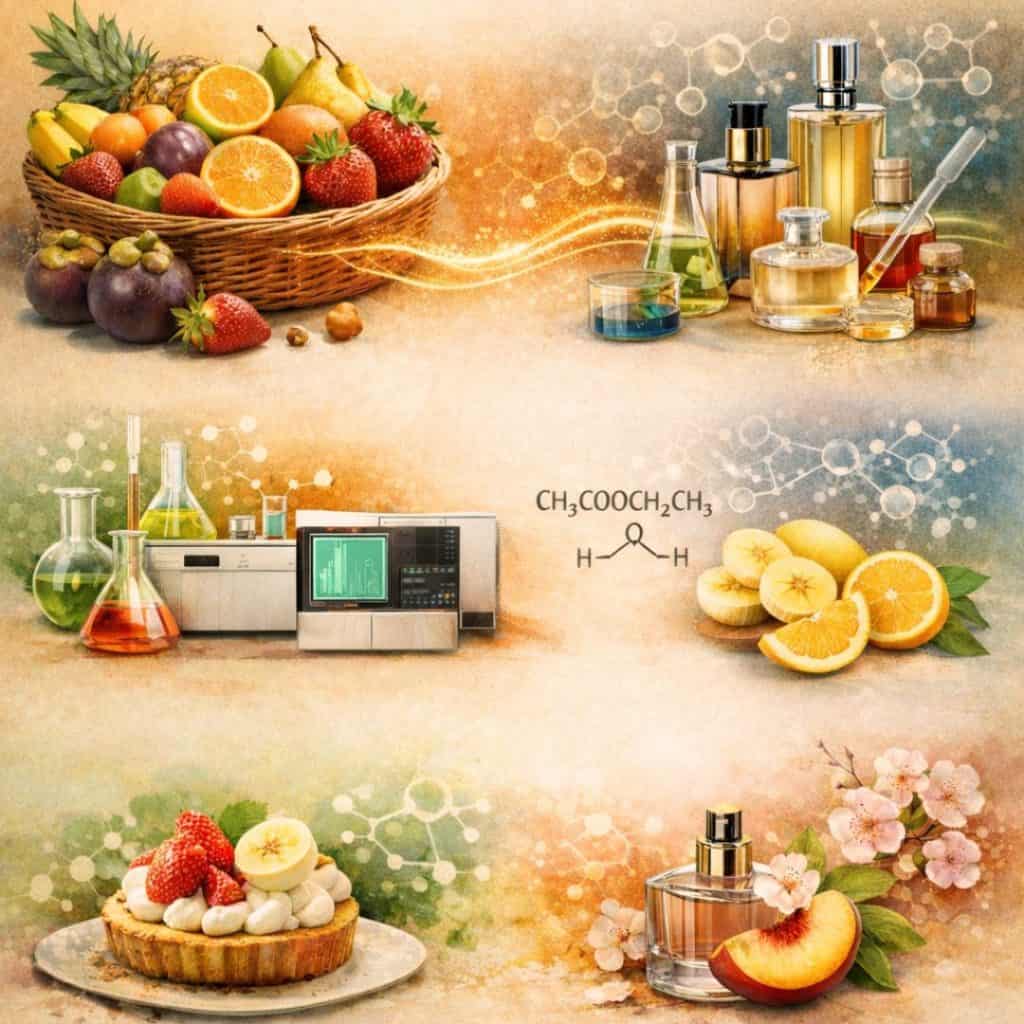 Parmi les centaines de composés identifiés dans les arômes de fruits, certains appartiennent aux classes des esters, alcools, aldéhydes, cétones ou hydrocarbures. Les esters, en particulier, confèrent des senteurs fruitées : par exemple, l’acétate d’isomyle évoque la banane, tandis que l’éthyl butyrate rappelle l’ananas. Les aldéhydes apportent des notes fraîches et citronnées, comme le citronellal qui confère une odeur de citron.