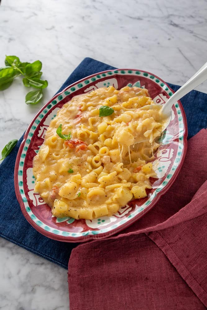 La pasta dovrà cuocere fino a diventare morbida e ben amalgamata con le patate, ottenendo così una consistenza cremosa.
